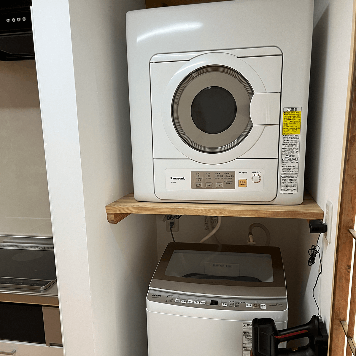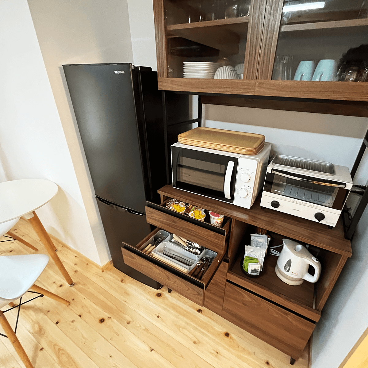 簡単な調理ができるキッチンがございます。調理用の鍋やキッチン用品と2口のガスコンロとシンク。冷蔵庫に電子レンジやトースターと電気ケトルもございます。棚にはいくつかお皿やコップなどもあり、コーヒーなどのフリードリンクに、夜食用にミニカップ麺もご用意してあります。